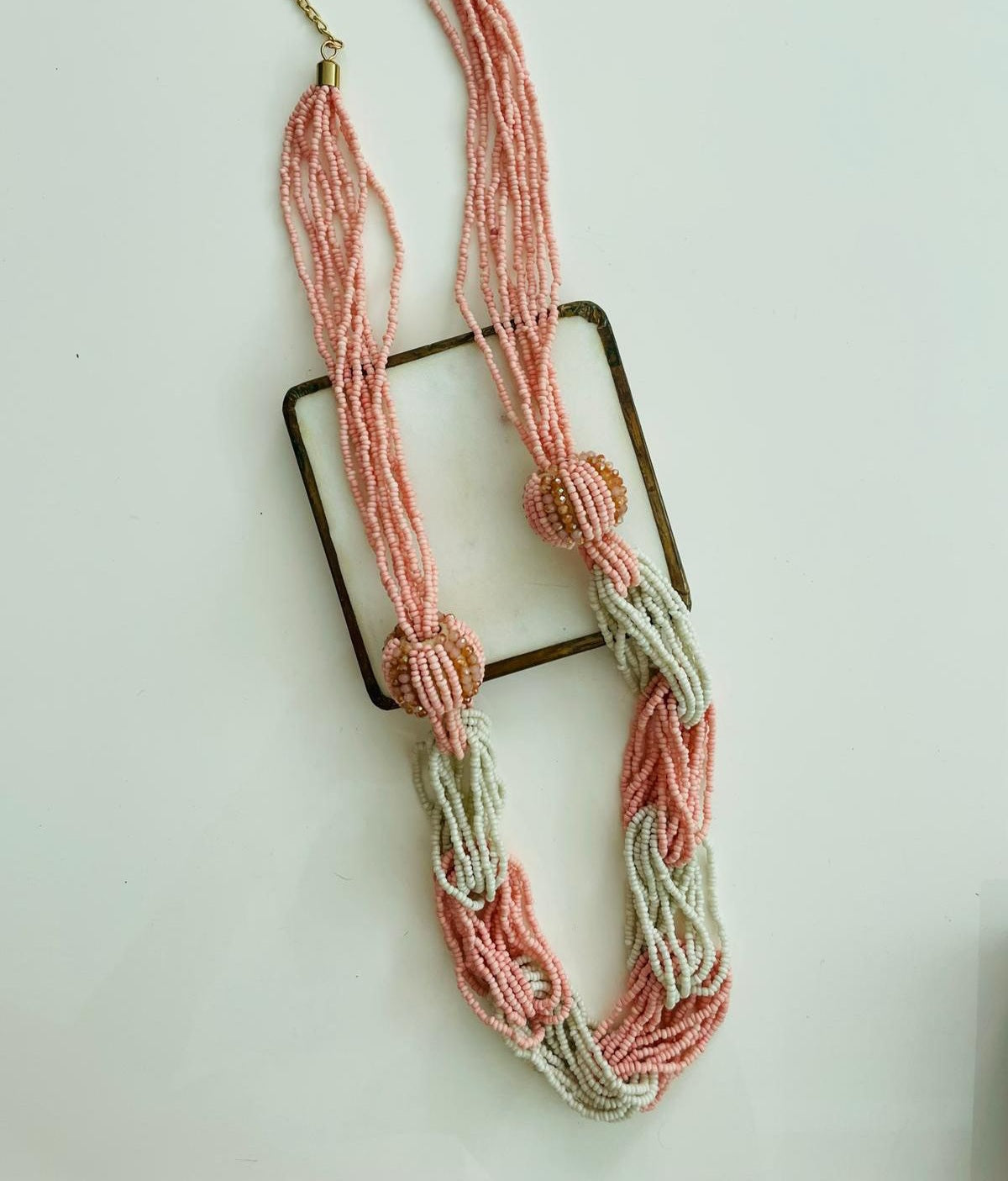 Un collar de tonos rosa claro y blanco. Trae pantallas color rosa claro. Medida: 29 pulgadas y se puede ajustar a 32 pulgadas.