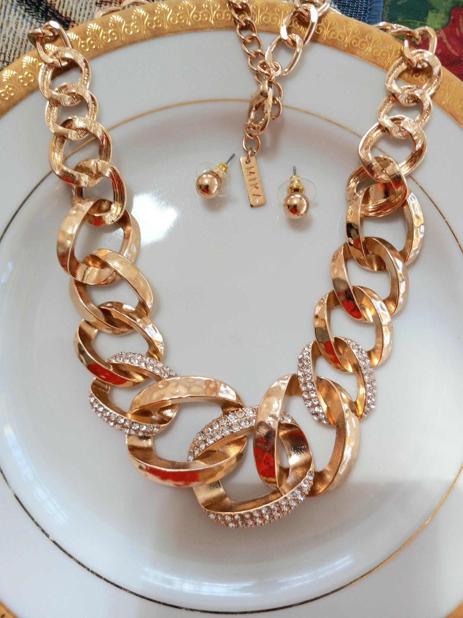 Este collar hará que luzcas más espectacular con sus hermosos eslabones en color oro. Trae pantallas en combinación.