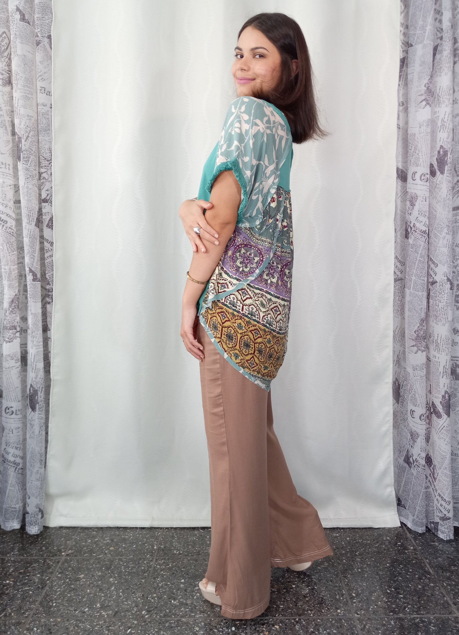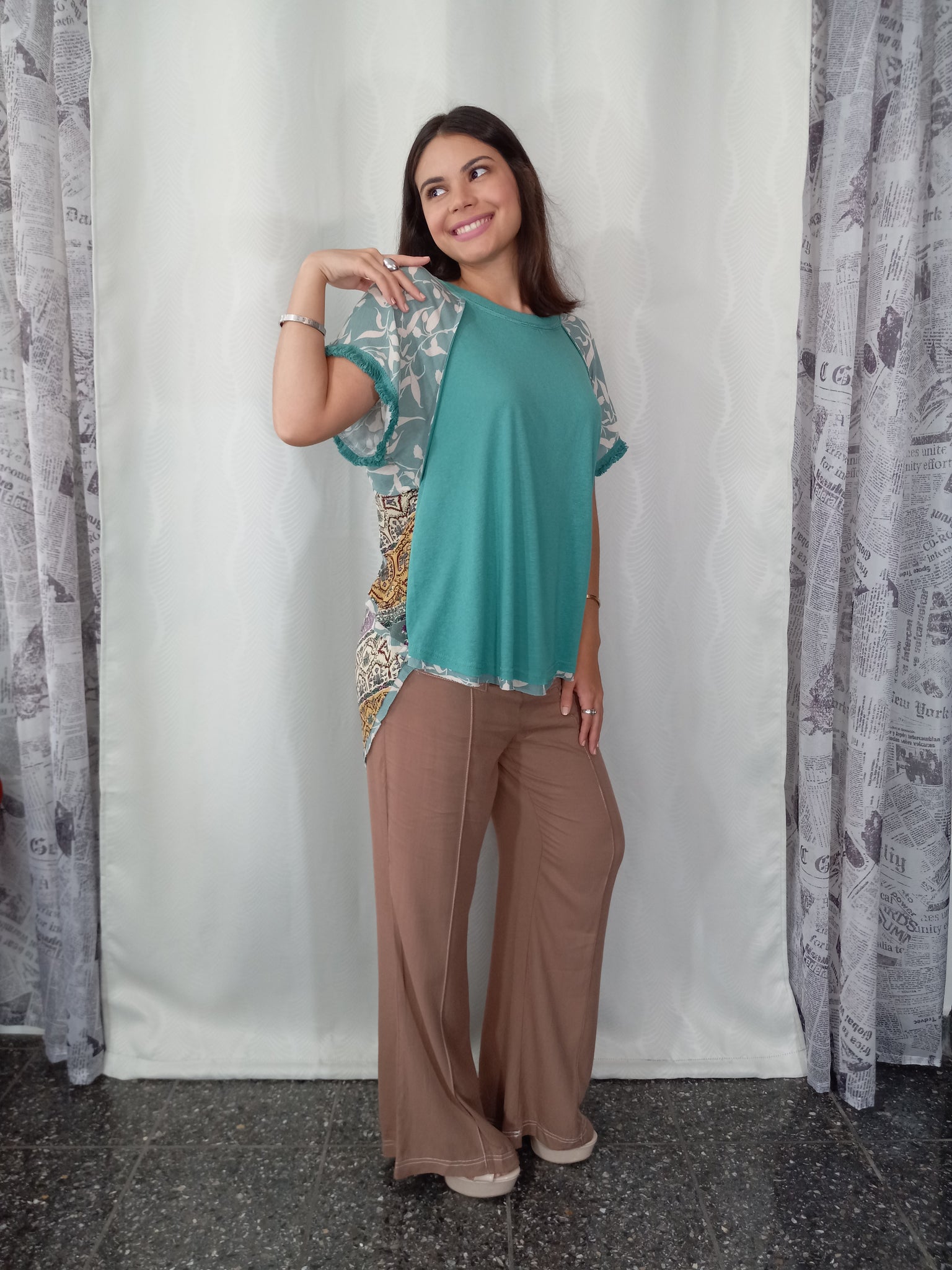 Este top está perfecto para tus actividades diarias. Es comodísimo y con un particular contraste de telas. El pantalón se vende por separado.