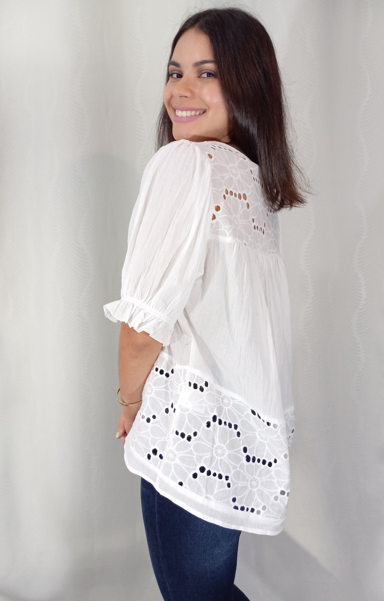 Blusa con detalles de flores en encaje, mangas cortas y abultadas . La comodidad y belleza se manifiestan en esta hermosa blusa blanca. ¡Lleva tu look casual a otro nivel!