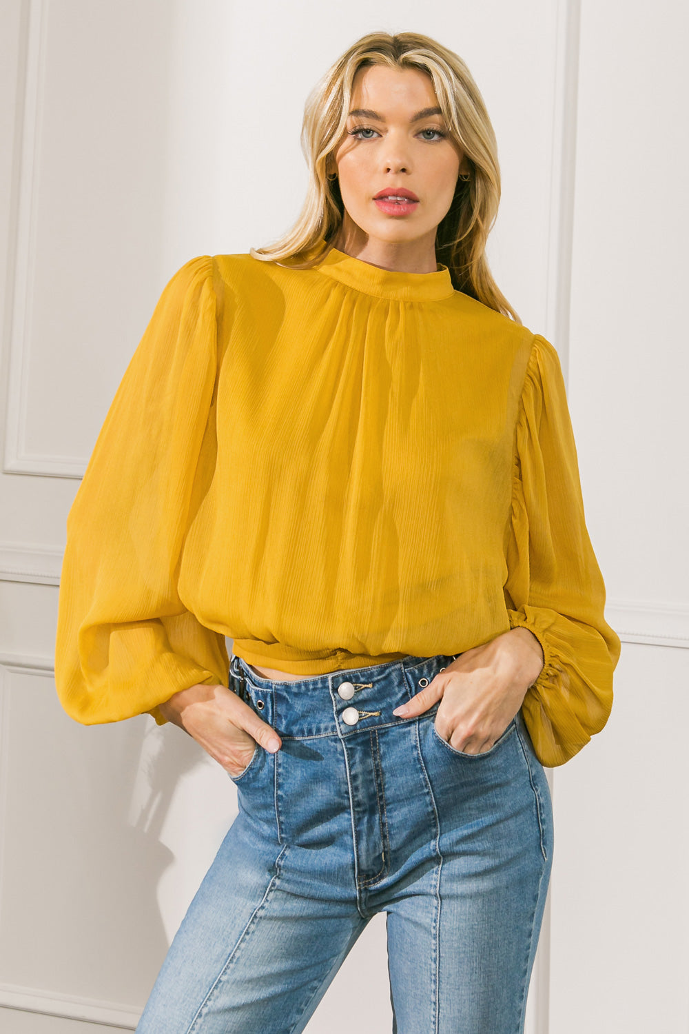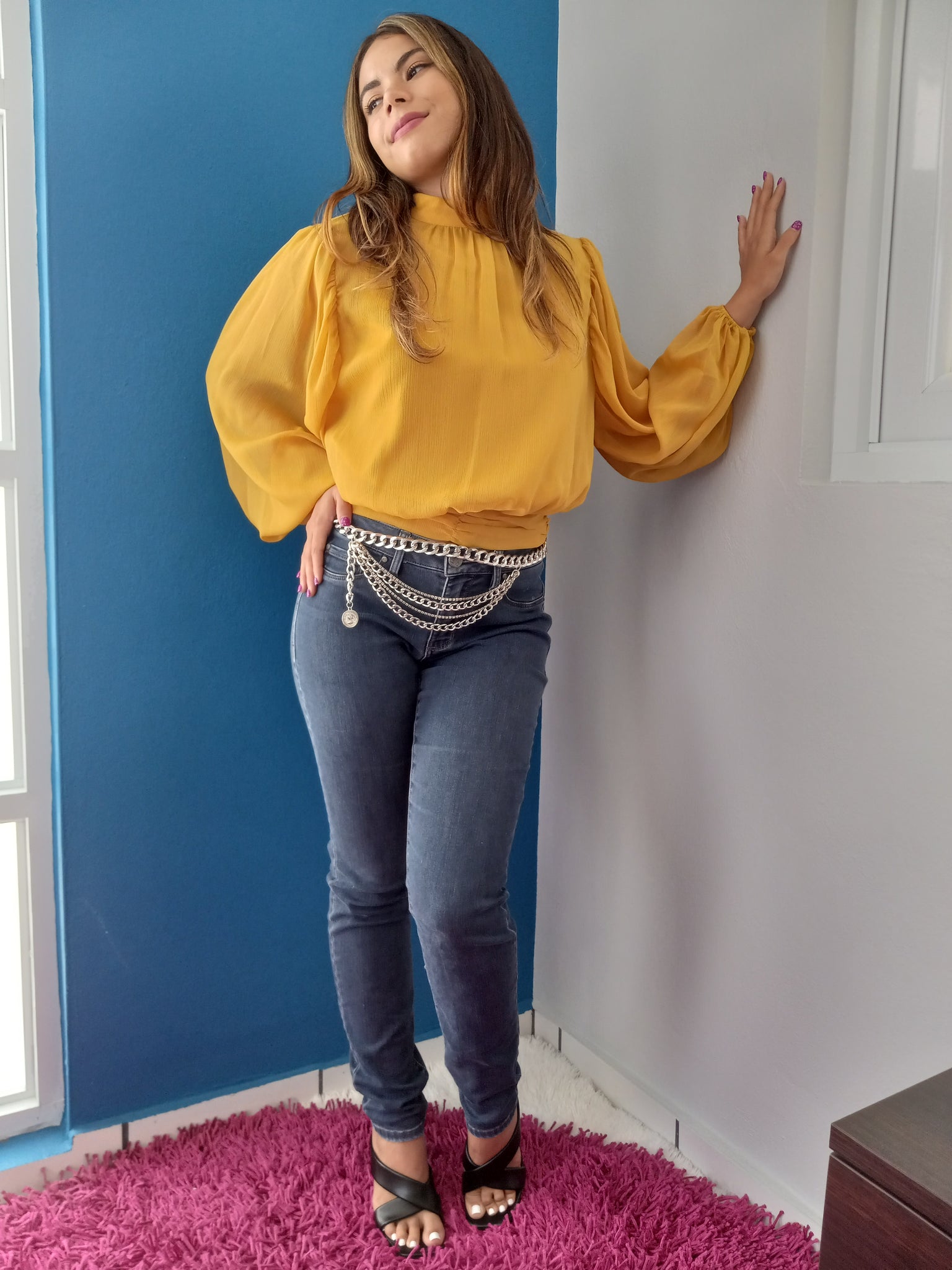 Blusa en tono amarillo mostaza con banda en la cintura que amarra atrás y con abertura en la espalda. El tamaño de la blusa en estas fotos es small.
