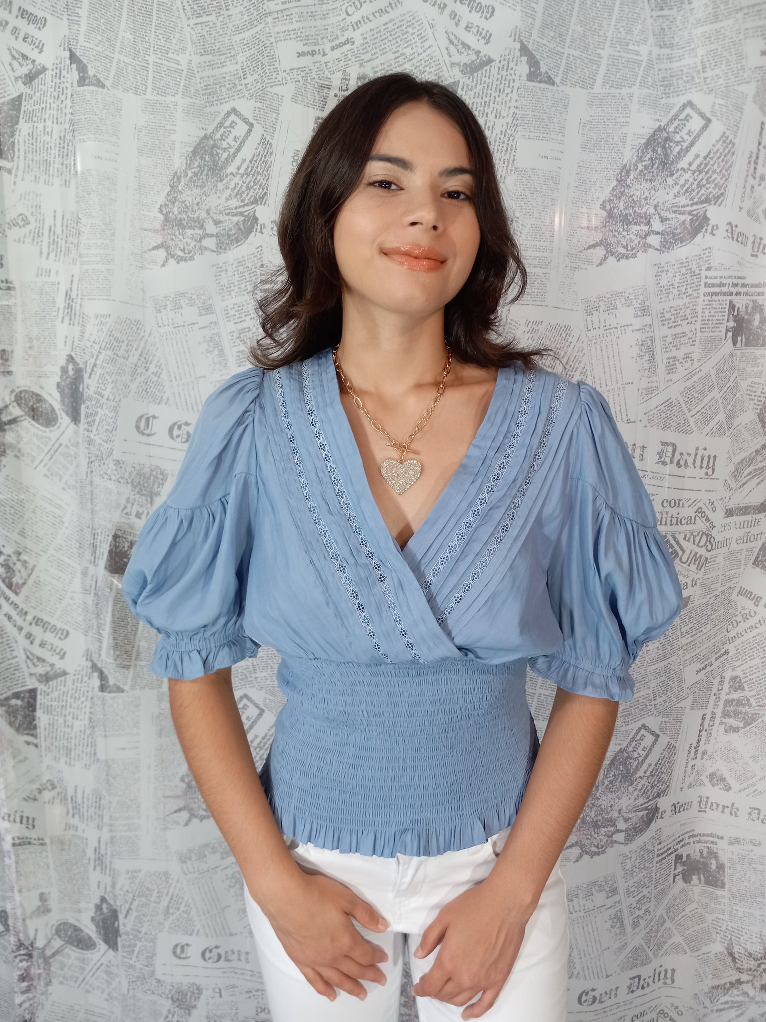 Top con manga abultada y adornos en encaje alrededor del escote. La parte de la cintura es fruncida.