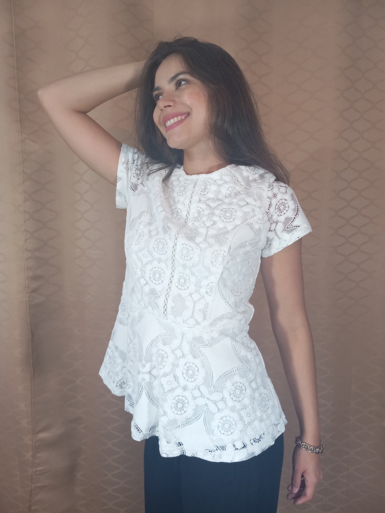 Bella blusa blanca en encaje y corte peplum. Tiene mangas cortas y amarra en la espalda con una cinta de forma cruzada. Esta pieza queda espectacular.