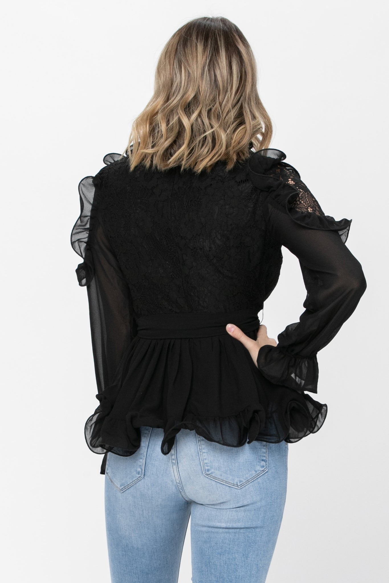 Hermosa blusa con detalles en encaje en su parte superior. Es elegante y en corte peplum.