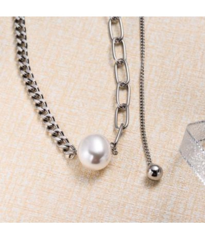 Collar con diferentes tipos de cadena en cada lado y con una perla en el medio. Tiene una tercera cadena en la parte de atrás. Medida: 18 pulgadas