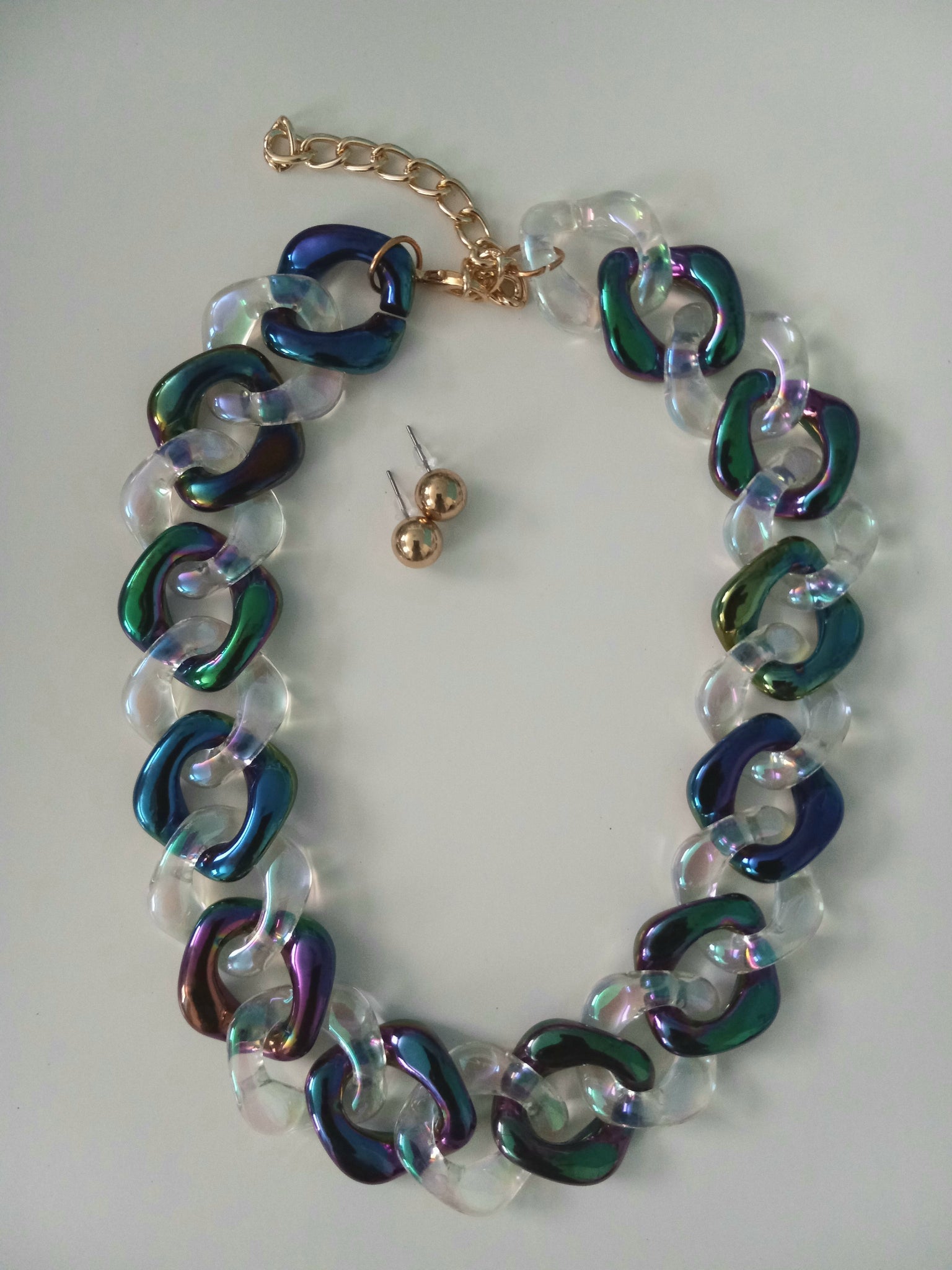 Collar en combinación de tornasol y clear. Es perfecto para combinar con tu ropa casual. Trae pantallas pequeñas color oro.